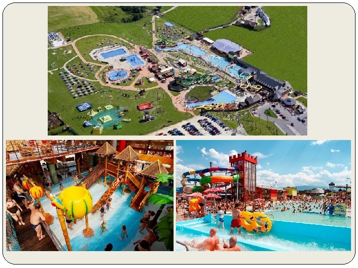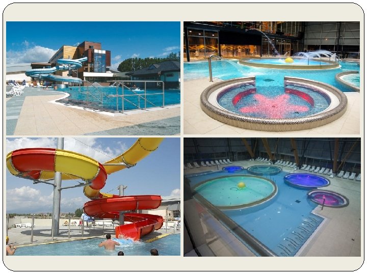 11 thermal swimming pools - 8 open throughout the year with thermal water of temperature 24 -39°C (3 covered) water attractions: swimming tracks, water crawling wall, massage sessions, water beds, little water mushrooms, gargoyles, water flows, water swings, water volley-ball and basketball, slides for children. . . 27 toboggan tracks and water slides (8 are open throughout the year) Tarzania climbing center, city or Summer Island Pirates of the Caribbean entertainment for children
