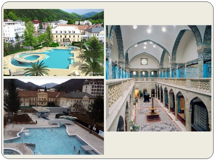 SPA TRENČIANSKE TEPLICE built on sulphurous mud and hot springs. 14 th century- one of the loveliest spa towns in the Hungarian Kingdom pearl of Carpathians (Mór Jókai) today-healing waters. resorts and pensions lending charm providing accommodation Hammam Hall Moorish marble- fountains water: 36, 6 -40, 2°C