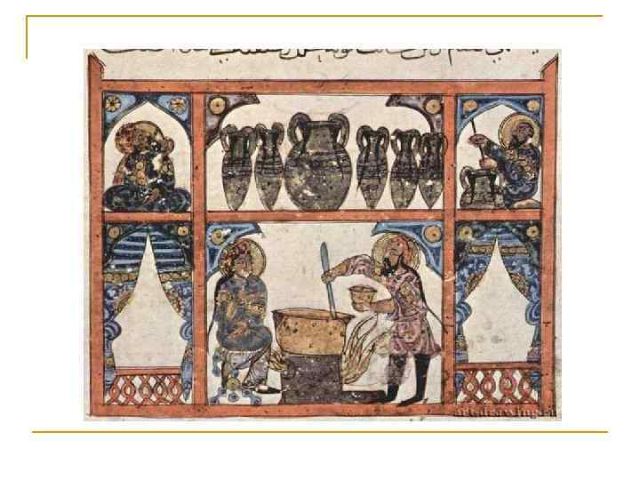 Нововведения n Арабами введены в фармацевтическую практику сахар (вместо меда) и лекарственные алкогольные сиропы. С лечебной целью они применяли пряности (мускус, корицу, мускатный орех, гвоздику и др. ) Рецепты арабов отличались сложностью и включали до 60 ингредиентов. Арабы готовили пилюли, кашки, сиропы, пластыри, душистые масла. В Дамаске было организовано специальное производство по перегонке ароматных вод, получению душистых мазей и других фармацевтических продуктов. Особого искусства достигли фармацевты в приготовлении эфирных и иных масел ( розовое масло), перегонке «смоляных масел» (можжевелового и др. ).