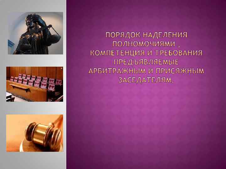 Арбитражные заседатели 25 лет он не старше 70 Безупречная репутация Высшее образование Стаж работы в экономической, финансовой, юридической, управленческой и предпринимательской деятельности не менее 5 лет. Гражданство РФ Присяжные заседатели 25 лет Гражданство РФ