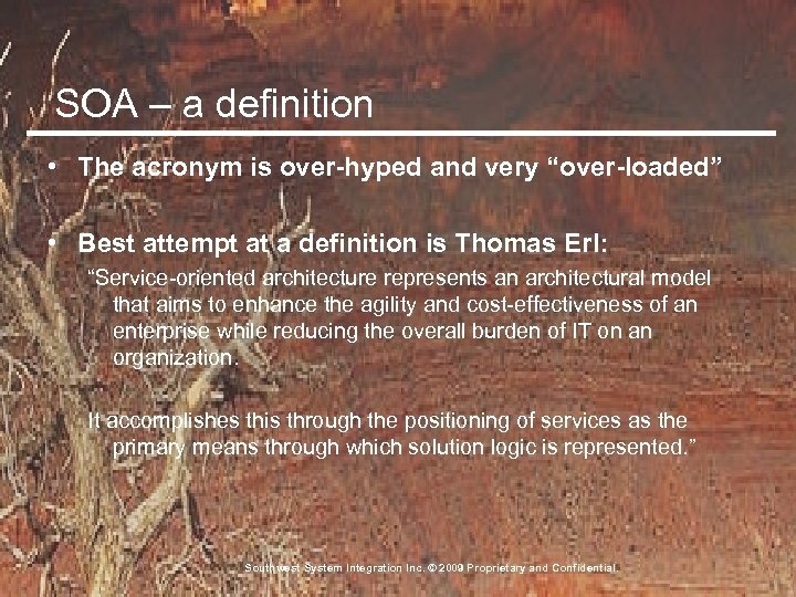 SOA – a definition • The acronym is over-hyped and very “over-loaded” • Best attempt at a definition is Thomas Erl: “Service-oriented architecture represents an architectural model that aims to enhance the agility and cost-effectiveness of an enterprise while reducing the overall burden of IT on an organization. It accomplishes this through the positioning of services as the primary means through which solution logic is represented. ” Southwest System Integration Inc. © 2009 Proprietary and Confidential.