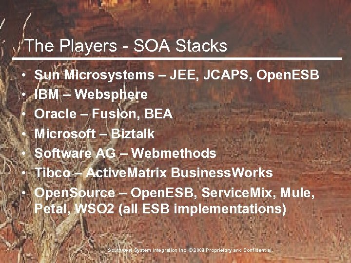 The Players - SOA Stacks • • Sun Microsystems – JEE, JCAPS, Open. ESB IBM – Websphere Oracle – Fusion, BEA Microsoft – Biztalk Software AG – Webmethods Tibco – Active. Matrix Business. Works Open. Source – Open. ESB, Service. Mix, Mule, Petal, WSO 2 (all ESB implementations) Southwest System Integration Inc. © 2009 Proprietary and Confidential.
