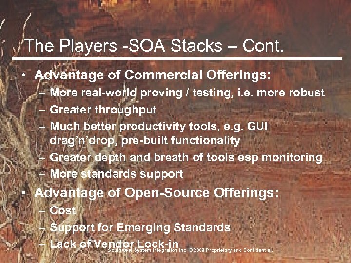 The Players -SOA Stacks – Cont. • Advantage of Commercial Offerings: – More real-world proving / testing, i. e. more robust – Greater throughput – Much better productivity tools, e. g. GUI drag’n’drop, pre-built functionality – Greater depth and breath of tools esp monitoring – More standards support • Advantage of Open-Source Offerings: – Cost – Support for Emerging Standards – Lack of Vendor. System Integration Inc. © 2009 Proprietary and Confidential. Lock-in Southwest