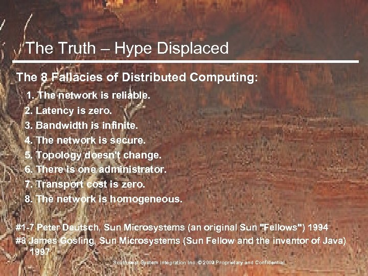 The Truth – Hype Displaced The 8 Fallacies of Distributed Computing: 1. The network is reliable. 2. Latency is zero. 3. Bandwidth is infinite. 4. The network is secure. 5. Topology doesn't change. 6. There is one administrator. 7. Transport cost is zero. 8. The network is homogeneous. #1 -7 Peter Deutsch, Sun Microsystems (an original Sun "Fellows") 1994 #8 James Gosling, Sun Microsystems (Sun Fellow and the inventor of Java) 1997 Southwest System Integration Inc. © 2009 Proprietary and Confidential.
