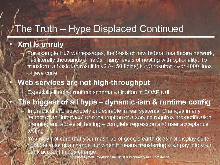 The Truth – Hype Displaced Continued • Xml is unruly – For example HL 7 v 3 messages, the basis of new federal healthcare network, has literally thousands of fields, many levels of nesting with optionality. To transform a basic lab result in v 2 (~150 fields) to v 3 resulted over 4000 lines of java code. • Web services are not high-throughput – Especially if doing runtime schema validation in SOAP call • The biggest of all hype – dynamic-ism & runtime config – Impractical and absolutely undesirable in real systems. Changes in any aspect of an “interface” or consumption of a service requires pre-notification, planning and above all testing – complete regression and user acceptance testing – You may not care that your mash-up of google earth does not display quite right because of a change but when it means transferring your pay into your bank account things change. Southwest System Integration Inc. © 2009 Proprietary and Confidential.