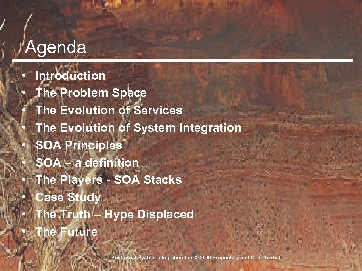 Agenda • • • Introduction The Problem Space The Evolution of Services The Evolution of System Integration SOA Principles SOA – a definition The Players - SOA Stacks Case Study The Truth – Hype Displaced The Future Southwest System Integration Inc. © 2009 Proprietary and Confidential.