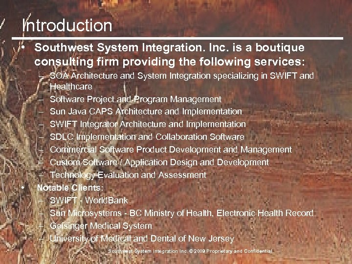 Introduction • Southwest System Integration. Inc. is a boutique consulting firm providing the following services: • – SOA Architecture and System Integration specializing in SWIFT and Healthcare – Software Project and Program Management – Sun Java CAPS Architecture and Implementation – SWIFT Integrator Architecture and Implementation – SDLC Implementation and Collaboration Software – Commercial Software Product Development and Management – Custom Software / Application Design and Development – Technology Evaluation and Assessment Notable Clients: – SWIFT - World. Bank – Sun Microsystems - BC Ministry of Health, Electronic Health Record – Geisinger Medical System – University of Medical and Dental of New Jersey Southwest System Integration Inc. © 2009 Proprietary and Confidential.
