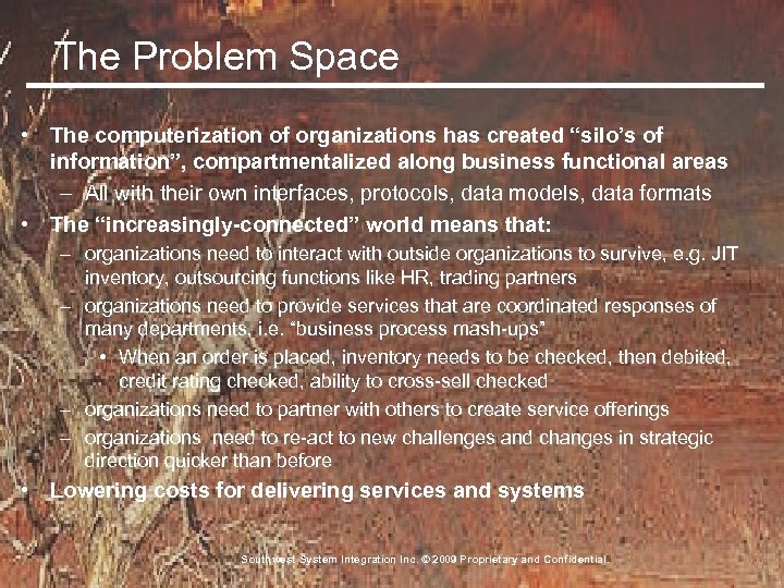 The Problem Space • The computerization of organizations has created “silo’s of information”, compartmentalized along business functional areas – All with their own interfaces, protocols, data models, data formats • The “increasingly-connected” world means that: – organizations need to interact with outside organizations to survive, e. g. JIT inventory, outsourcing functions like HR, trading partners – organizations need to provide services that are coordinated responses of many departments, i. e. “business process mash-ups” • When an order is placed, inventory needs to be checked, then debited, credit rating checked, ability to cross-sell checked – organizations need to partner with others to create service offerings – organizations need to re-act to new challenges and changes in strategic direction quicker than before • Lowering costs for delivering services and systems Southwest System Integration Inc. © 2009 Proprietary and Confidential.
