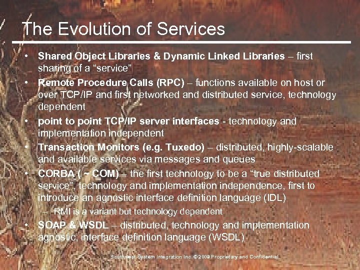 The Evolution of Services • Shared Object Libraries & Dynamic Linked Libraries – first sharing of a “service” • Remote Procedure Calls (RPC) – functions available on host or over TCP/IP and first networked and distributed service, technology dependent • point to point TCP/IP server interfaces - technology and implementation independent • Transaction Monitors (e. g. Tuxedo) – distributed, highly-scalable and available services via messages and queues • CORBA ( ~ COM) – the first technology to be a “true distributed service”, technology and implementation independence, first to introduce an agnostic interface definition language (IDL) – RMI is a variant but technology dependent • SOAP & WSDL – distributed, technology and implementation agnostic, interface definition language (WSDL) Southwest System Integration Inc. © 2009 Proprietary and Confidential.