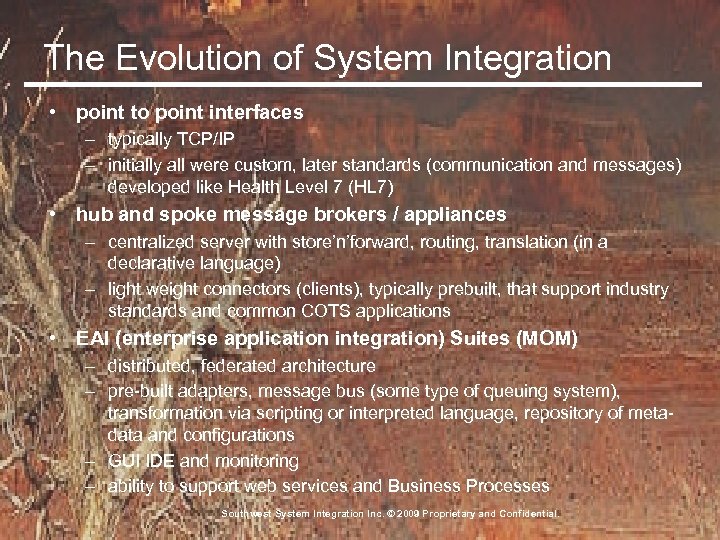 The Evolution of System Integration • point to point interfaces – typically TCP/IP – initially all were custom, later standards (communication and messages) developed like Health Level 7 (HL 7) • hub and spoke message brokers / appliances – centralized server with store’n’forward, routing, translation (in a declarative language) – light weight connectors (clients), typically prebuilt, that support industry standards and common COTS applications • EAI (enterprise application integration) Suites (MOM) – distributed, federated architecture – pre-built adapters, message bus (some type of queuing system), transformation via scripting or interpreted language, repository of metadata and configurations – GUI IDE and monitoring – ability to support web services and Business Processes Southwest System Integration Inc. © 2009 Proprietary and Confidential.