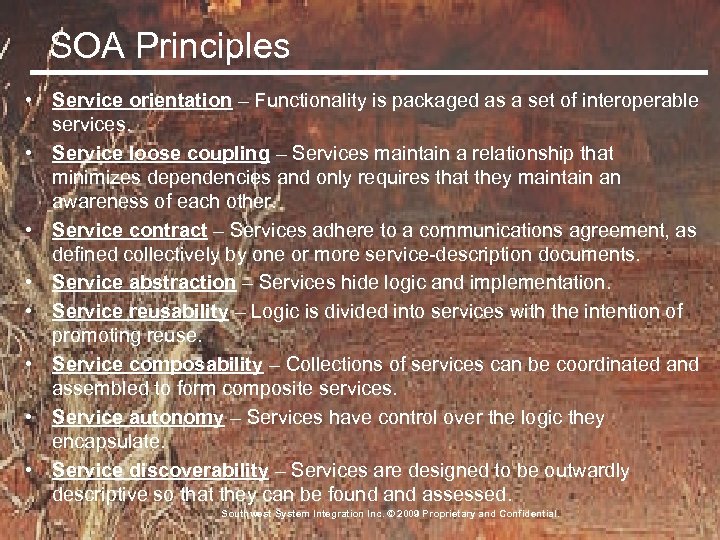 SOA Principles • Service orientation – Functionality is packaged as a set of interoperable services. • Service loose coupling – Services maintain a relationship that minimizes dependencies and only requires that they maintain an awareness of each other. • Service contract – Services adhere to a communications agreement, as defined collectively by one or more service-description documents. • Service abstraction – Services hide logic and implementation. • Service reusability – Logic is divided into services with the intention of promoting reuse. • Service composability – Collections of services can be coordinated and assembled to form composite services. • Service autonomy – Services have control over the logic they encapsulate. • Service discoverability – Services are designed to be outwardly descriptive so that they can be found assessed. Southwest System Integration Inc. © 2009 Proprietary and Confidential.
