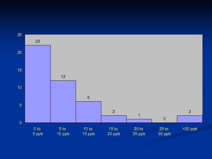 25 22 20 15 12 10 6 5 2 1 0 0 to 5 ppb 5 to 10 ppb 10 to 15 ppb 15 to 20 ppb 20 to 25 ppb 2 0 25 to 30 ppb >30 ppb
