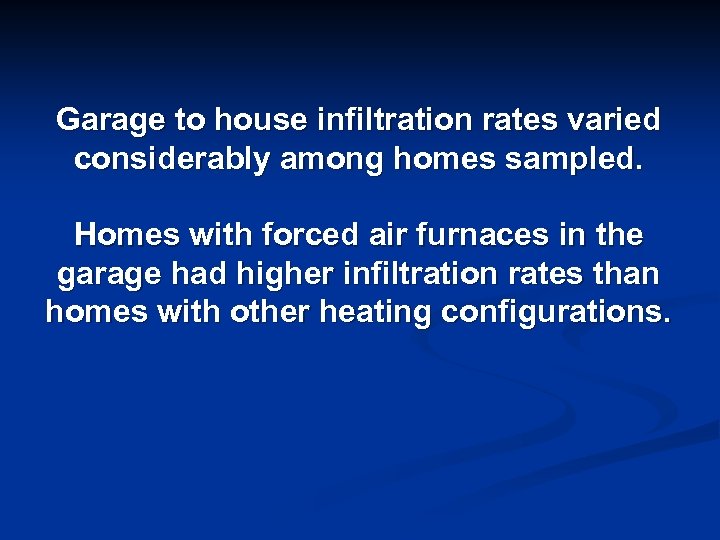 Garage to house infiltration rates varied considerably among homes sampled. Homes with forced air furnaces in the garage had higher infiltration rates than homes with other heating configurations.