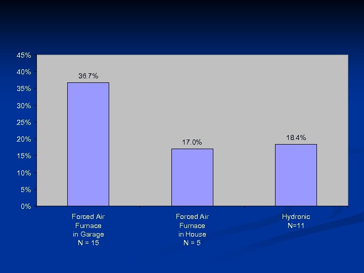 45% 40% 36. 7% 35% 30% 25% 20% 17. 0% 18. 4% 15% 10% 5% 0% Forced Air Furnace in Garage N = 15 Forced Air Furnace in House N=5 Hydronic N=11