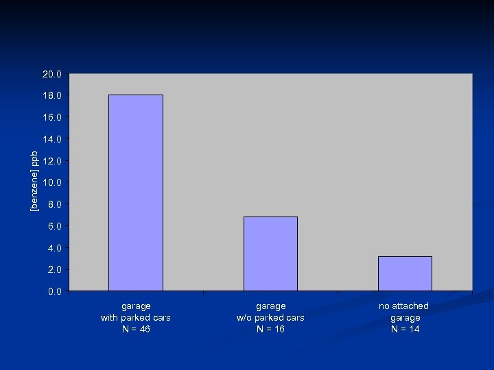 20. 0 18. 0 16. 0 [benzene] ppb 14. 0 12. 0 10. 0 8. 0 6. 0 4. 0 2. 0 0. 0 garage with parked cars N = 46 garage w/o parked cars N = 16 no attached garage N = 14