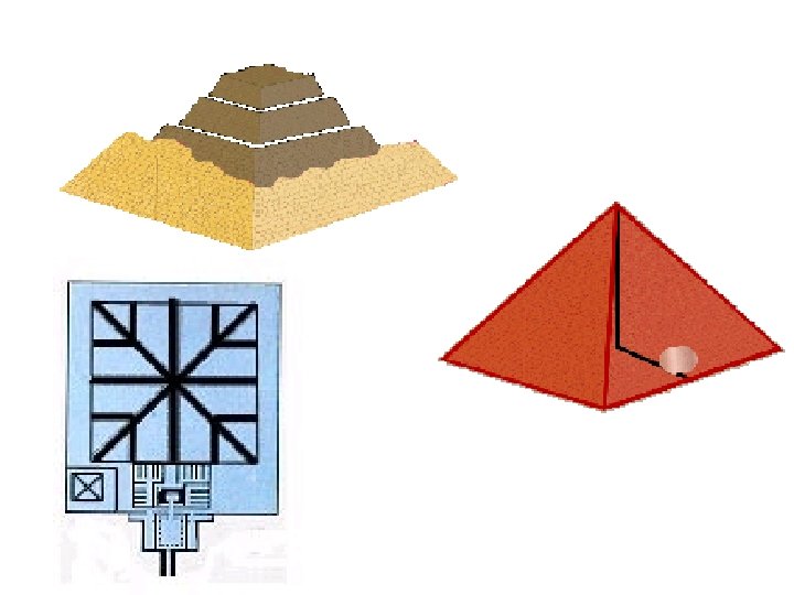 Egyptians - 2550 B. C. • The architecture was based upon perpendicular structures and inclined planes since there was no structural assistance except the strength and balance of the structure itself. • The size, design, and structure of the pyramids reveal the skill of these ancient builders. The pyramids were great monuments and tombs for the kings.
