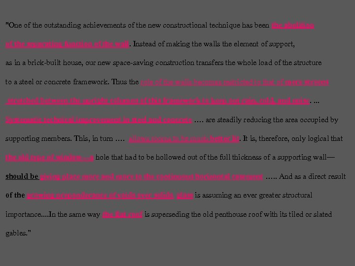 "One of the outstanding achievements of the new constructional technique has been the abolition of the separating function of the wall. Instead of making the walls the element of support, as in a brick-built house, our new space-saving construction transfers the whole load of the structure to a steel or concrete framework. Thus the role of the walls becomes restricted to that of mere screens stretched between the upright columns of this framework to keep out rain, cold, and noise. . Systematic technical improvement in steel and concrete …. are steadily reducing the area occupied by supporting members. This, in turn …. allows rooms to be much better lit. It is, therefore, only logical that the old type of window—a hole that had to be hollowed out of the full thickness of a supporting wall— should be giving place more and more to the continuous horizontal casement …. . And as a direct result of the growing preponderance of voids over solids, glass is assuming an ever greater structural importance. . In the same way the flat roof is superseding the old penthouse roof with its tiled or slated gables. ”