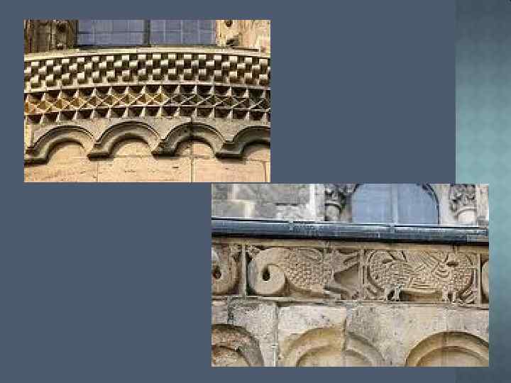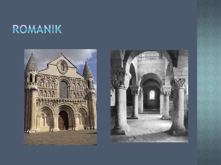 Rundbögen dicke, festungsartige Mauern kleine Fenstern Würfelkapitelle flache Kassettendecken, später Kreuzgratgewölbe Rosetten Kassettendecken- кессоны -кассеты, квадратные или многоугольные декоративные углубления в потолочном своде или на внутренней поверхности арки. Kreuzgratgewölbeкрестовыйсвод