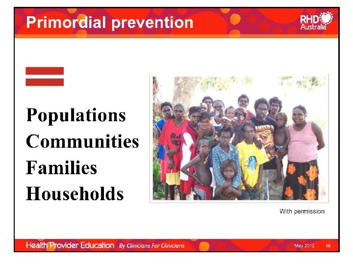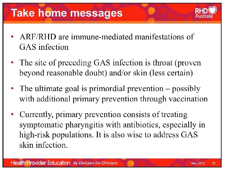 Primordial prevention of ARF/RHD • • • Housing Education Employment Communications Transport & access to services Mc. Donald E et al. BMC Public Health 2008; 8: 153 Mc. Donald M et al. Clin Infect Dis 2006; 43: 683 -9 Bailie R et al. BMC Public Health 2010; 10: 147