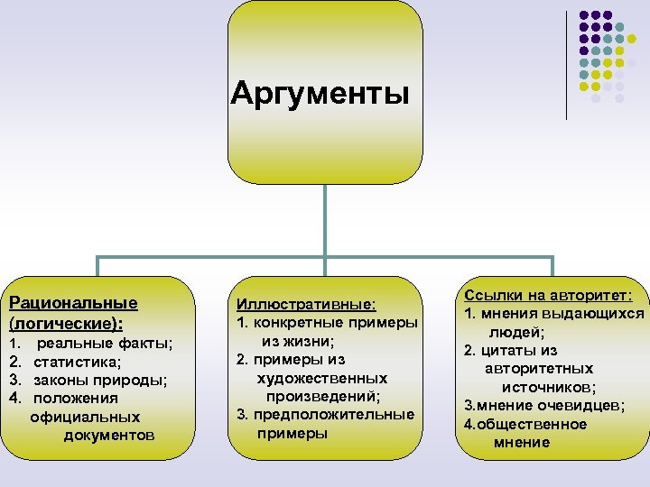 Аргументы Рациональные (логические): 1. реальные факты; 2. статистика; 3. законы природы; 4. положения официальных документов Иллюстративные: 1. конкретные примеры из жизни; 2. примеры из художественных произведений; 3. предположительные примеры Ссылки на авторитет: 1. мнения выдающихся людей; 2. цитаты из авторитетных источников; 3. мнение очевидцев; 4. общественное мнение