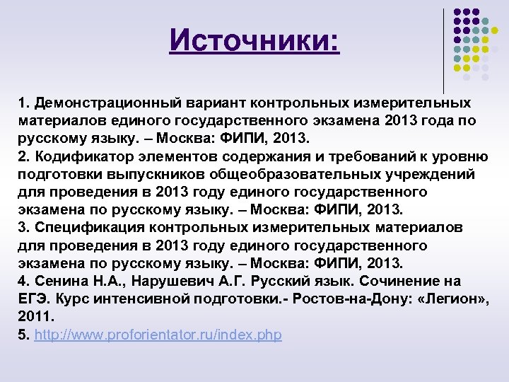 Источники: 1. Демонстрационный вариант контрольных измерительных материалов единого государственного экзамена 2013 года по русскому языку. – Москва: ФИПИ, 2013. 2. Кодификатор элементов содержания и требований к уровню подготовки выпускников общеобразовательных учреждений для проведения в 2013 году единого государственного экзамена по русскому языку. – Москва: ФИПИ, 2013. 3. Спецификация контрольных измерительных материалов для проведения в 2013 году единого государственного экзамена по русскому языку. – Москва: ФИПИ, 2013. 4. Сенина Н. А. , Нарушевич А. Г. Русский язык. Сочинение на ЕГЭ. Курс интенсивной подготовки. Ростов на Дону: «Легион» , 2011. 5. http: //www. proforientator. ru/index. php