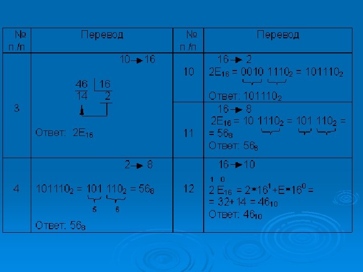 Сводная таблица переводов целых чисел из одной системы счисления в другую Рассмотрим только те системы счисления, которые применяются в компьютерах — десятичную, двоичную, восьмеричную и шестнадцатеричную. Для определенности возьмем произвольное десятичное число, например 46, и для него выполним все возможные последовательные переводы из одной системы счисления в другую. Порядок переводов определим в соответствии с рисунком: На этом рисунке использованы следующие обозначения: -в кружках записаны основания систем счисления; -стрелки указывают направление перевода; -номер рядом со стрелкой означает порядковый номер соответствующего примера в сводной таблице 4. 1. Например: означает перевод из двоичной системы в шестнадцатеричную, имеющий в таблице порядковый номер 6.