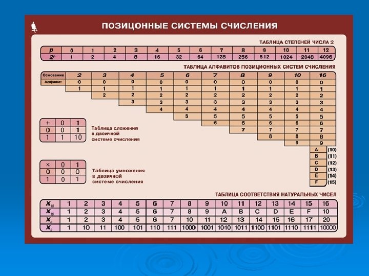 Вот такие системы счисления используют специалисты Кроме десятичной широко используются системы с основанием, являющимся целой степенью числа 2, а именно: двоичная (используются цифры 0, 1); восьмеричная (используются цифры 0, 1, . . . , 7); шестнадцатеричная (для первых целых чисел от нуля до девяти используются цифры 0, 1, . . . , 9, а для следующих чисел — от десяти до пятнадцати — в качестве цифр используются символы A, B, C, D, E, F). Полезно запомнить запись в этих системах счисления первых двух десятков целых чисел: