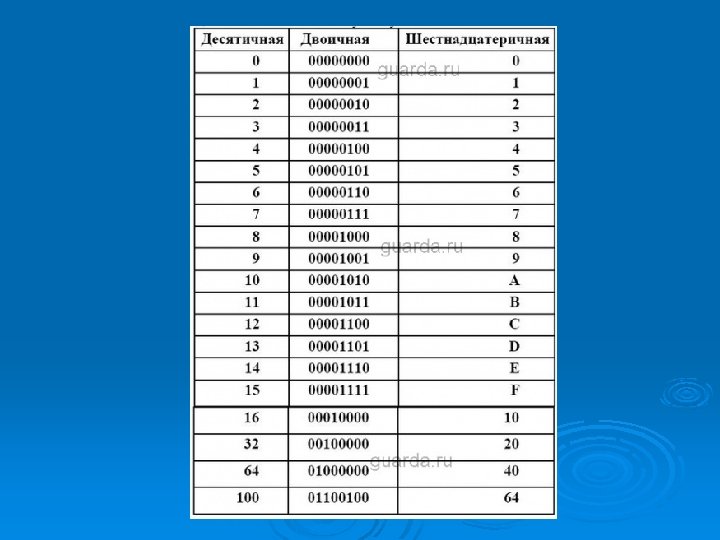 Так же в компьютерах используют восьмеричную и шестнадцатеричную Двоичная система, удобная для компьютеров, для человека неудобна из-за ее громоздкости и непривычной записи. Перевод чисел из десятичной системы в двоичную и наоборот выполняет машина. Однако, чтобы профессионально использовать компьютер, следует научиться понимать слово машины. Для этого и разработаны восьмеричная и шестнадцатеричная системы. Числа в этих системах читаются почти так же легко, как десятичные, требуют соответственно в три (восьмеричная) и в четыре (шестнадцатеричная) раза меньше разрядов, чем в двоичной системе (ведь числа 8 и 16 — соответственно, третья и четвертая степени числа 2). Перевод восьмеричных и шестнадцатеричных чисел в двоичную систему очень прост: достаточно каждую цифру заменить эквивалентной ей двоичной триадой (тройкой цифр) или тетрадной (четверкой цифр). Например: