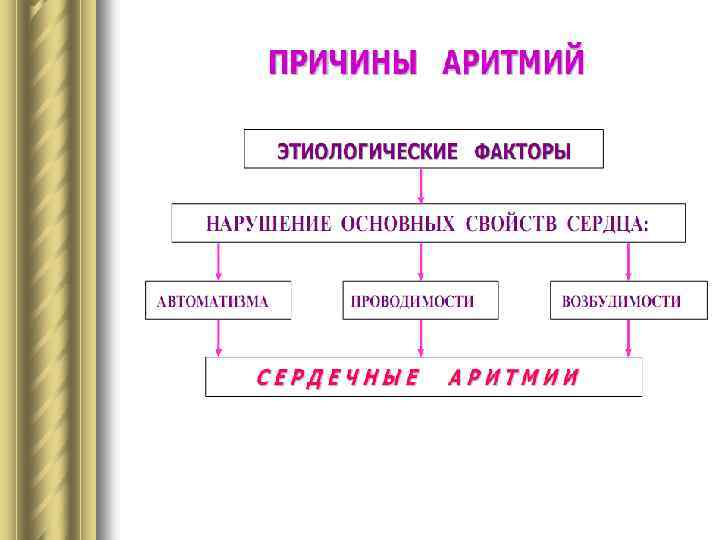 Аритмии l Аритмии — типовая форма патологии сердца, характеризующаяся нарушением частоты и периодичности генерации им импульсов возбуждения. l Аритмии являются следствием нарушения основных свойств сердечной мышцы: автоматизма, проводимости и возбудимости