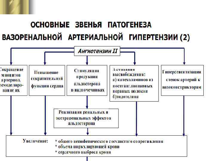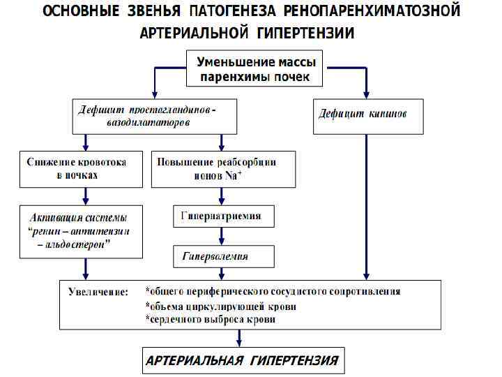 Ситуационные задачи 6. Больная П. , 19 лет, жалуется на отеки, преимущественно на лице, головную боль, постоянную ноющую боль в поясничной области, мочу цвета «мясных помоев» . Заболевание началось остро 5 дней назад. В анамнезе частые ангины, 2 недели назад перенесла отит. При обследовании обнаружена бледность кожных покровов, общие отеки с преимущественной локализацией на лице, вокруг глаз. Пульс редкий, напряженный, верхушечный толчок сердца смещен влево на 2 см. и усилен, АД повышено – 150/100. При аускультации определяется акцент второго тона над аортой, приглушение сердечных тонов и слабый систолический шум на верхушке сердца. Анализ мочи: уд. вес – 1023, белок – 340 мг/л, в осадке – лейкоциты, эритроциты до 1000 в поле зрения, зернистые и гиалиновые цилиндры, клетки почечного эпителия. Вопросы: Какое заболевание у больной? Этиология и патогенез данного заболевания? Почему произошло смещение верхушечного толчка? Объясните механизм развития почечной артериальной гипертензии. Классификация артериальных гипертензий. Каковы механизмы регуляции АД почками?