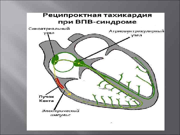 Аритмия при нарушении проводимости 1. Увеличение проводимости (WPW синдром) Синдром Вольфа-Паркинсона-Уайта (WPW-синдром) — врождённая аномалия строения сердца. Наиболее частый синдром преждевременного возбуждения желудочков (его наблюдают у 0, 1 — 0, 3 % населения в общей популяции ), возникающий при наличии дополнительного пучка Кента. Большинство людей при этом не имеют признаков заболевания сердца. У мужчин синдром обнаруживают чаще, чем у женщин. Пучок Кента — аномальный пучок между левым предсердием и одним из желудочков. Этот пучок играет важную роль в патогенезе синдрома WPW. Врожденный дополнительный путь проведения (пучок Кента) проводит импульсы возбуждения от предсердий к желудочкам в обход обычному пути (через атриовентрикулярный-АВ-узел), что приводит к раннему возбуждению желудочков, а при определенных условиях - развитию тахикардии. Более быстрое распространение импульса через этот дополнительный проводящий путь приводит к: укорочению интервала P — R (P — Q); более раннему возбуждению части желудочков — возникает волна Δ, обуславливающая расширение комплекса QRS.