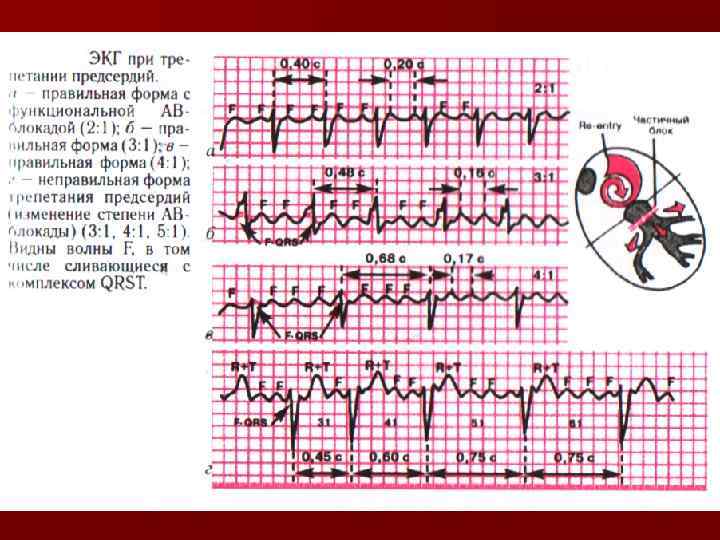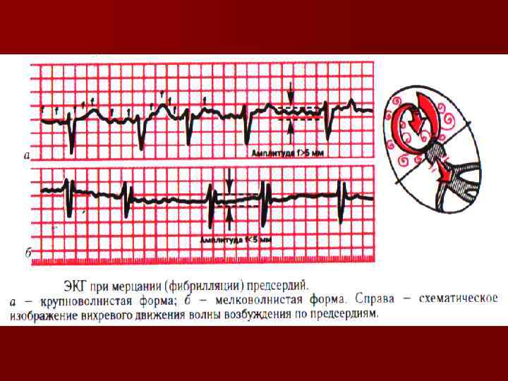 n Трепетание предсердий и желудочков проявляется высокой частотой импульсов возбуждения и, как правило, сокращений сердца правильного ритма (предсердий обычно 220 -350 в минуту, желудочков — 150 -300 в минуту) Характеризуется отсутствием диастолической паузы и поверхностными, гемодинамически неэффективными сокращениями миокарда. n Мерцание предсердий развивается при частоте эктопических импульсов более 400— 500 в минуту, желудочков — более 300 -500 в минуту Фибрилляция (мерцание) предсердий и желудочков представляет нерегулярную, беспорядочную электрическую активность предсердий и желудочков, сопровождающуюся прекращением эффективной насосной функции сердца. .