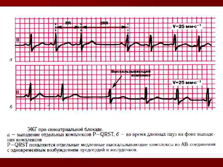 Синусовая брадикардия Уменьшение в покое частоты генерации в синусопредсердном узле импульсов возбуждения менее 40 -60 в минуту с одинаковыми интервалами между ними Причины n Активация влияния парасимп сист. n Конституционная, спортивная, рефлекторновагусная, при активации ваговагального рефлекса, в постинфекционном периоде Изменения ЭКГ: увеличение длительности интервала R-R, при правильном чередовании зубца P и комплекса QRS