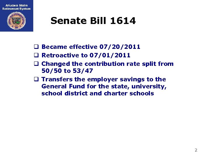 Arizona State Retirement System ASRS Contribution Rate Split q SB 1614 q Barnes vs. ASRS and State of Arizona q HB 2264 Alternate Contribution Rate q SB 1609 1