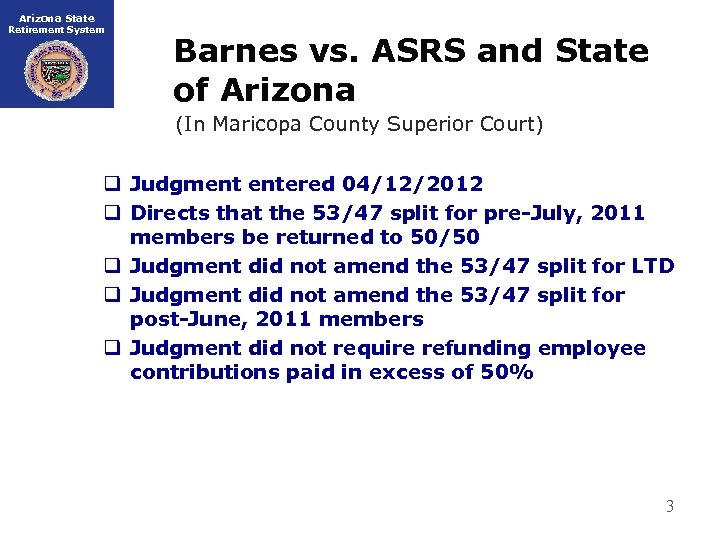 Arizona State Retirement System Senate Bill 1614 q Became effective 07/20/2011 q Retroactive to 07/01/2011 q Changed the contribution rate split from 50/50 to 53/47 q Transfers the employer savings to the General Fund for the state, university, school district and charter schools 2