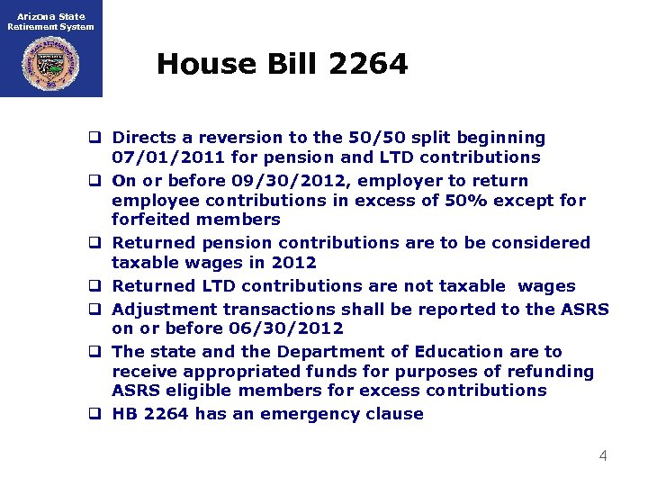 Arizona State Retirement System Barnes vs. ASRS and State of Arizona (In Maricopa County Superior Court) q Judgment entered 04/12/2012 q Directs that the 53/47 split for pre-July, 2011 members be returned to 50/50 q Judgment did not amend the 53/47 split for LTD q Judgment did not amend the 53/47 split for post-June, 2011 members q Judgment did not require refunding employee contributions paid in excess of 50% 3