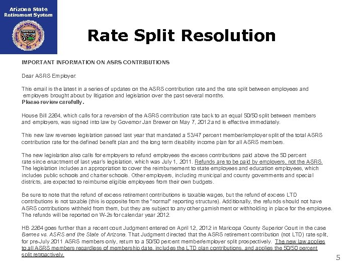 Arizona State Retirement System House Bill 2264 q Directs a reversion to the 50/50 split beginning 07/01/2011 for pension and LTD contributions q On or before 09/30/2012, employer to return employee contributions in excess of 50% except forfeited members q Returned pension contributions are to be considered taxable wages in 2012 q Returned LTD contributions are not taxable wages q Adjustment transactions shall be reported to the ASRS on or before 06/30/2012 q The state and the Department of Education are to receive appropriated funds for purposes of refunding ASRS eligible members for excess contributions q HB 2264 has an emergency clause 4