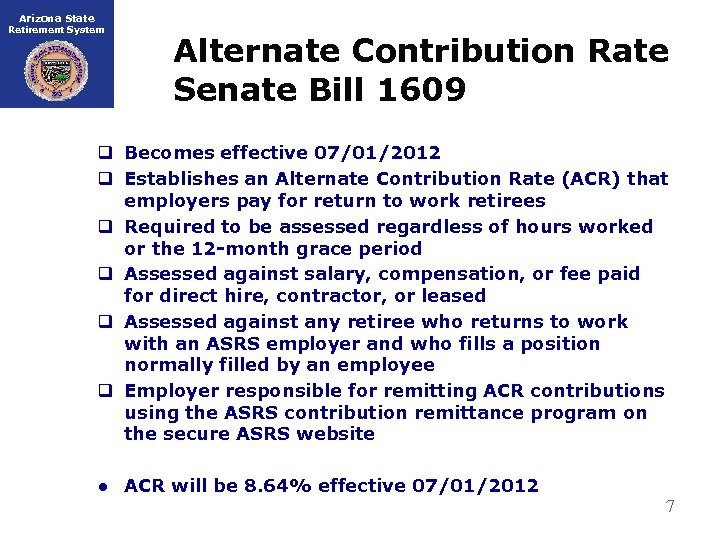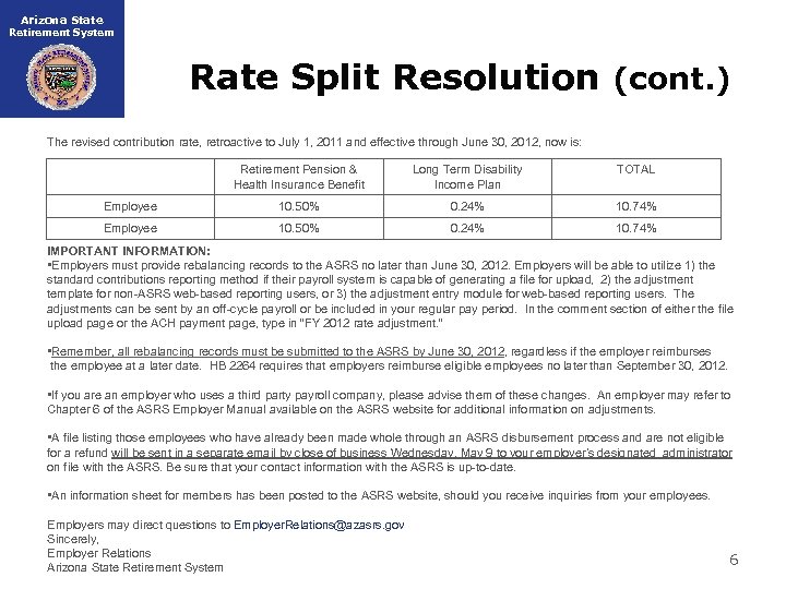Arizona State Retirement System Rate Split Resolution (cont. ) The revised contribution rate, retroactive to July 1, 2011 and effective through June 30, 2012, now is: Retirement Pension & Health Insurance Benefit Long Term Disability Income Plan TOTAL Employee 10. 50% 0. 24% 10. 74% IMPORTANT INFORMATION: • Employers must provide rebalancing records to the ASRS no later than June 30, 2012. Employers will be able to utilize 1) the standard contributions reporting method if their payroll system is capable of generating a file for upload, 2) the adjustment template for non-ASRS web-based reporting users, or 3) the adjustment entry module for web-based reporting users. The adjustments can be sent by an off-cycle payroll or be included in your regular pay period. In the comment section of either the file upload page or the ACH payment page, type in “FY 2012 rate adjustment. ” • Remember, all rebalancing records must be submitted to the ASRS by June 30, 2012, regardless if the employer reimburses the employee at a later date. HB 2264 requires that employers reimburse eligible employees no later than September 30, 2012. • If you are an employer who uses a third party payroll company, please advise them of these changes. An employer may refer to Chapter 6 of the ASRS Employer Manual available on the ASRS website for additional information on adjustments. • A file listing those employees who have already been made whole through an ASRS disbursement process and are not eligible for a refund will be sent in a separate email by close of business Wednesday, May 9 to your employer’s designated administrator on file with the ASRS. Be sure that your contact information with the ASRS is up-to-date. • An information sheet for members has been posted to the ASRS website, should you receive inquiries from your employees. Employers may direct questions to Employer. Relations@azasrs. gov Sincerely, Employer Relations Arizona State Retirement System 6