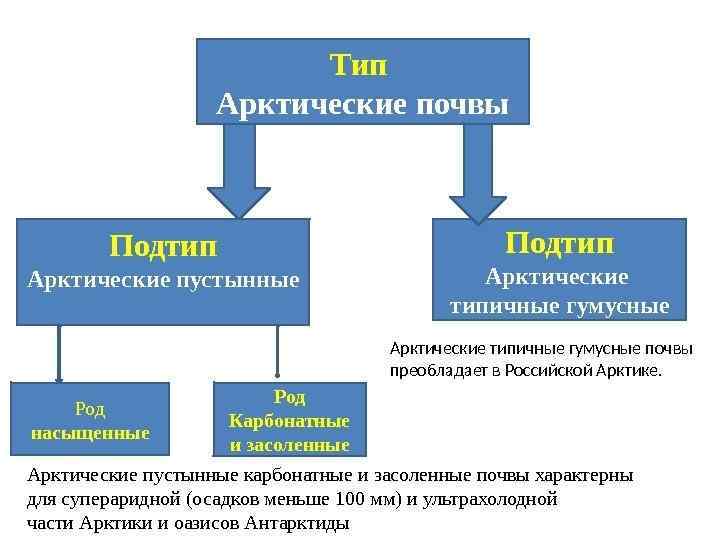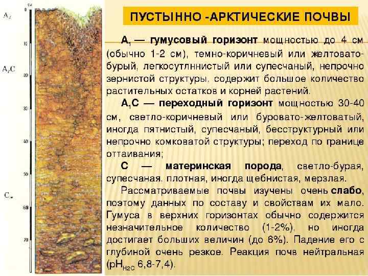 Аркти ческие по чвы — почвы, которые формируются в арктическом поясе, преимущественно на островах Северного Ледовитого океана Формирование Низкая температура воздуха, многолетняя мерзлота, развитие солифлюкции и избыточное увлажнение обуславливают угнетенность процессов почвообразования, по этой причине развивается преимущественно маломощная слабо гумусированная разновидность почв с укороченным профилем и невыраженными генетическими горизонтами. Арктические почвы имеют слабокислую или близкую к нейтральной реакцию, оглеение (восстановительные процессы) отсутствует. География Находятся главным образом в Сибири, на Аляске и в Канаде. Меньшие по площади области этих почв находятся в Андах , Тибете, Северной Скандинавии и свободных ото льда частей Гренландии и Антарктиды. Ископаемые арктические почвы известны еще в ледниковых периодах докембрия 900 миллионов лет назад.