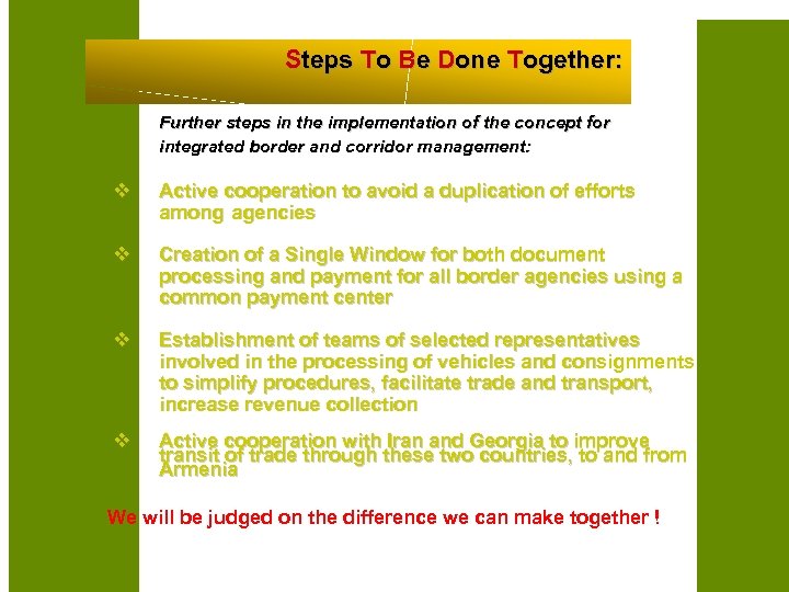 Steps To Be Done Together: Further steps in the implementation of the concept for integrated border and corridor management: v Active cooperation to avoid a duplication of efforts among agencies v Creation of a Single Window for both document processing and payment for all border agencies using a common payment center v Establishment of teams of selected representatives involved in the processing of vehicles and consignments to simplify procedures, facilitate trade and transport, increase revenue collection v Active cooperation with Iran and Georgia to improve transit of trade through these two countries, to and from Armenia We will be judged on the difference we can make together !