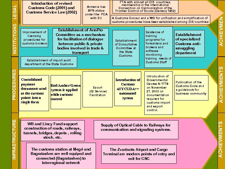 A Customs Consul and a WG for unification and simplification of customs procedures have been established among CIS countries Establishment of Consultative Committee at the State Customs. PROCEDURES Consolidated payment documents used at the customs points into a single form Red/Amber/Green system is applied while customs control Escort (02 Service) Facilitation WB and Lincy Fund support construction of roads, railways, tunnels, bridges, depots , rolling stock, etc. The customs station at Megri and Bagratashen are well equiped and connected (Bagratashen) to 3/19/2018 interregional network Introduction of Customs ASYCUDA++ automated system Existence of training programs forwarders and brokers and software monitoring training needs of Customs Staff Introduction of Governmental Decree N-1779 on November 21, 2003 on documentation required for customs import and export control. Establishment of specialized Customs antismuggling department Publication of the Customs Code and a guidebook for business community ACHIEVMENTS Establishment of Arm. Pro Committee as a mechanism for facilitation of dialogue between public & private bodies involved in trade & transport ACHIEVMENTS Improvement of licensing procedures for customs brokers Armenia has MFN status under the PCA with EU FTA with almost all CIS countries, membership in the International Convention on Harmonization of the Frontier Control of Goods (Geneva 1982) ACHIEVMENTS INSTITUTIONS LEGAL Introduction of revised Customs Code (2001) and Customs Service Law (2002) Establishment of import audit department at the State Customs INFRASTRUCTURE Supply of Optical Cable to Railways for communication and signaling systems. The Zvartnots Airport and Cargo Terminal are modern points of entry and exit for CSC 5
