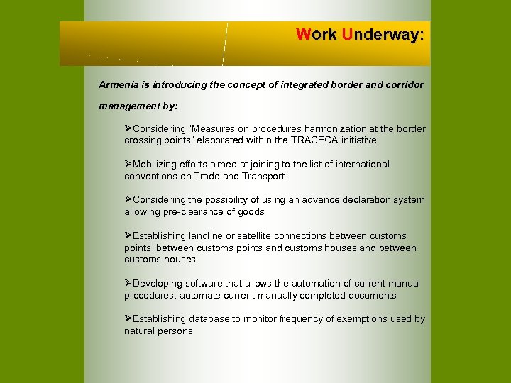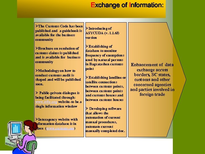 ØThe Customs Code has been published and a guidebook is available for the business community ØBrochure on resolution of customs claims is published and is available for business community ØMethodology on how to conduct customs audit is shaped and will be published soon. Ø Public-private dialogue is being facilitated through: www. ttfsc. org website-to be a single information window ØInteragency website with information database is in place (www. customs. am) Exchange of Information: ØIntroducing of ASYCUDA (v. 1. 1. 6 f) version ØEstablishing of database to monitor frequency of exemptions used by natural persons in Bagratashen customs Enhancement of data point exchange across borders, SC states, ØEstablishing landline or customs and other satellite connections concerned agencies between customs points, customs points and parties involved in between foreign trade and customs houses and between customs houses Ø Developing software that allows the automation of current manual procedures, automate current manually completed doc.
