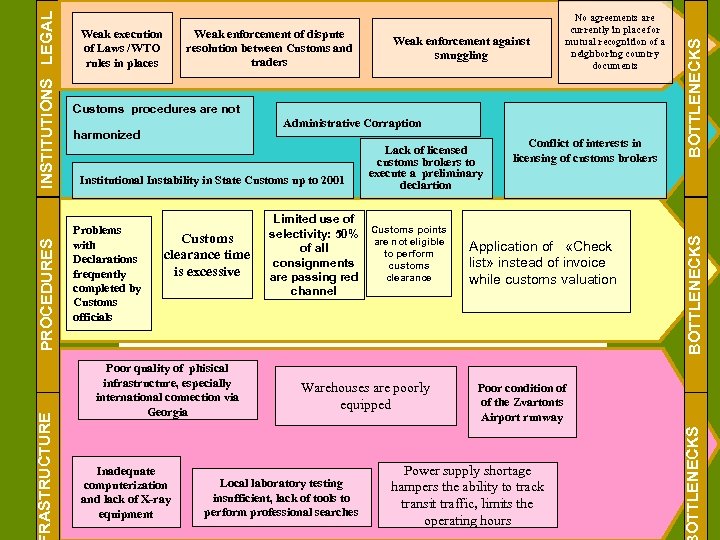 Bottlenecks Weak enforcement of dispute resolution between Customs and traders Weak execution of Laws /WTO rules in places Weak enforcement against smuggling Customs procedures are not Administrative Corraption Institutional Instability in State Customs up to 2001 Problems with Declarations frequently completed by Customs officials Customs clearance time is excessive Poor quality of phisical infrastructure, especially international connection via Georgia Inadequate computerization and lack of X-ray equipment 3/19/2018 Limited use of selectivity: 50% of all consignments are passing red channel Lack of licensed customs brokers to execute a preliminary declartion Customs points are not eligible to perform customs clearance Warehouses are poorly equipped Local laboratory testing insufficient, lack of tools to perform professional searches Conflict of interests in licensing of customs brokers BOTTLENECKS harmonized BOTTLENECKS No agreements are currently in place for mutual recognition of a neighboring country documents Application of «Check list» instead of invoice while customs valuation Poor condition of of the Zvartonts Airport runway Power supply shortage hampers the ability to track transit traffic, limits the operating hours 7 OTTLENECKS INSTITUTIONS LEGAL PROCEDURES RASTRUCTURE