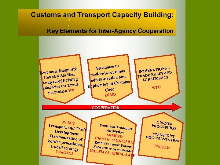 Customs and Transport Capacity Building: Key Elements for Inter-Agency Cooperation to Assistance TIONAL iagnostic INTERNA mic D stoms D cu Econo ULES AN s, modernize TRADE R ENTS try Studie nd Coun ation a ing AGREEM administr is of Exist nalys ustoms A o n f C Trade implicatio stacles for WTO Ob Code tion WB promo USAID COOPERATION UN ECE CUSTOM Trade and Transport PROCED Transport URES and Trade Facilitatio Developm n ent TRANS ARMPRO Harmoniz of C DOCUME PORT Chamber ation of NTATION &I of RA border pr Road Tra ocedures, nsp UNCTAD Forwarde ort Unions, transit str rs ategy IRU, FIAT Associations, TRACEC A, AIRCA A , AAFF 3/19/2018 9