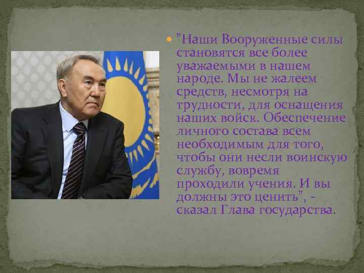 "Наши Вооруженные силы становятся все более уважаемыми в нашем народе. Мы не жалеем средств, несмотря на трудности, для оснащения наших войск. Обеспечение личного состава всем необходимым для того, чтобы они несли воинскую службу, вовремя проходили учения. И вы должны это ценить", - сказал Глава государства.
