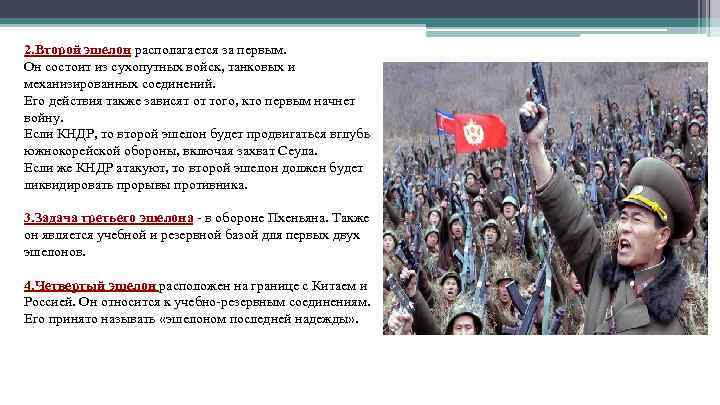 2. Второй эшелон располагается за первым. Он состоит из сухопутных войск, танковых и механизированных соединений. Его действия также зависят от того, кто первым начнет войну. Если КНДР, то второй эшелон будет продвигаться вглубь южнокорейской обороны, включая захват Сеула. Если же КНДР атакуют, то второй эшелон должен будет ликвидировать прорывы противника. 3. Задача третьего эшелона - в обороне Пхеньяна. Также он является учебной и резервной базой для первых двух эшелонов. 4. Четвертый эшелон расположен на границе с Китаем и Россией. Он относится к учебно-резервным соединениям. Его принято называть «эшелоном последней надежды» .