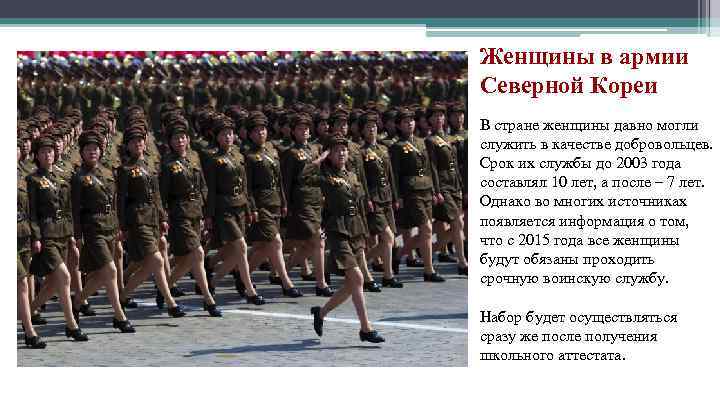Женщины в армии Северной Кореи В стране женщины давно могли служить в качестве добровольцев. Срок их службы до 2003 года составлял 10 лет, а после – 7 лет. Однако во многих источниках появляется информация о том, что с 2015 года все женщины будут обязаны проходить срочную воинскую службу. Набор будет осуществляться сразу же после получения школьного аттестата.