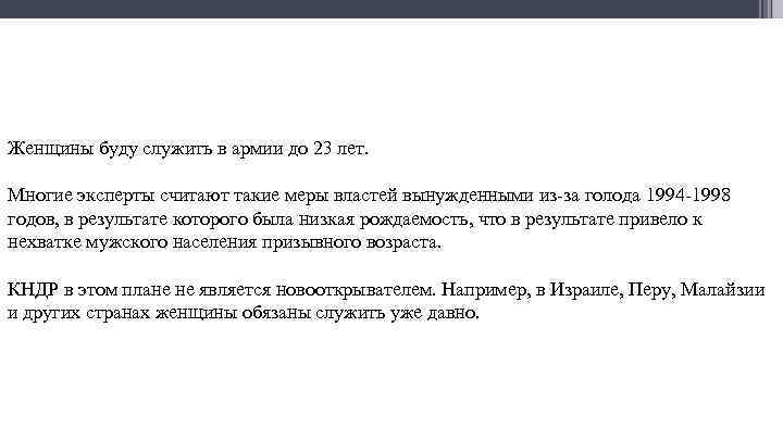 Женщины буду служить в армии до 23 лет. Многие эксперты считают такие меры властей вынужденными из-за голода 1994 -1998 годов, в результате которого была низкая рождаемость, что в результате привело к нехватке мужского населения призывного возраста. КНДР в этом плане не является новооткрывателем. Например, в Израиле, Перу, Малайзии и других странах женщины обязаны служить уже давно.