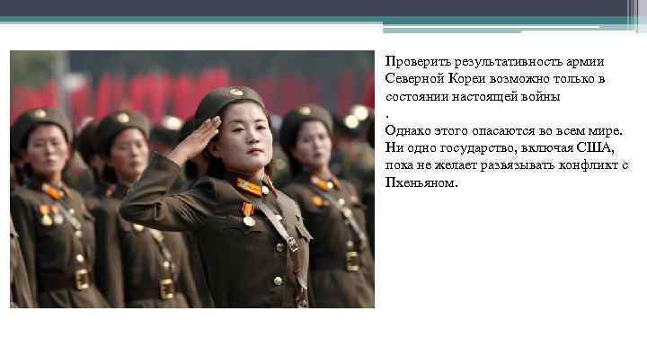 Проверить результативность армии Северной Кореи возможно только в состоянии настоящей войны. Однако этого опасаются во всем мире. Ни одно государство, включая США, пока не желает развязывать конфликт с Пхеньяном.