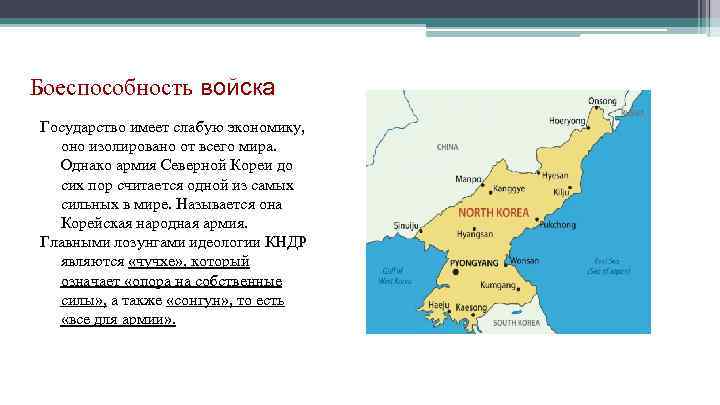 Боеспособность войска Государство имеет слабую экономику, оно изолировано от всего мира. Однако армия Северной Кореи до сих пор считается одной из самых сильных в мире. Называется она Корейская народная армия. Главными лозунгами идеологии КНДР являются «чучхе» , который означает «опора на собственные силы» , а также «сонгун» , то есть «все для армии» .